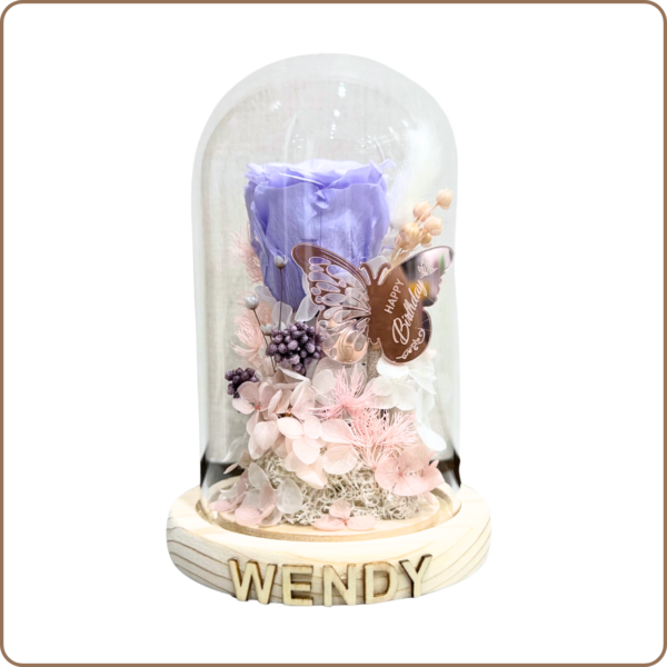 Add a personal touch by customising it with vinyl or wood lettering to make it uniquely yours! You may also choose a set of figurines from our adorable range to make your special floral dome even livelier!